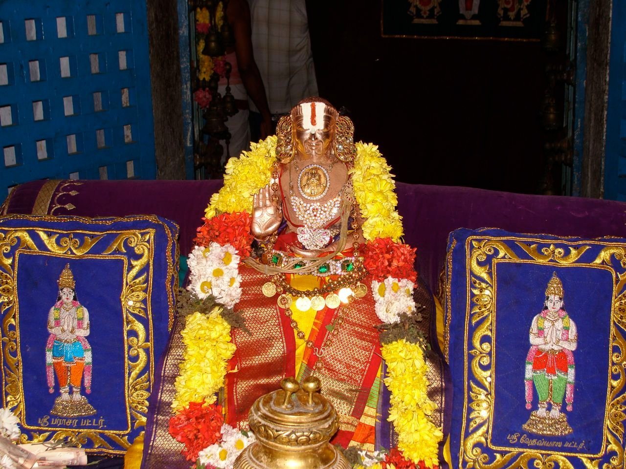 - emperumAnAr thiru nAmaththAl – The author of this thaniyan, sOmAsiyANdAn loves to use the name ‘emperumAnAr’, hence he says that name in this thaniyan instead of saying rAmAnusar. “sOmAsiyANdAn ’emperumAnAr’ enRAl thirunAmam niRam peRumAp pOlEyum’ [eedu for thiruvAimozhi 6.5.7] (the name ’emperumAnAr’ gets its full meaning when it is said by sOmAsiyANdAn). There is an issue with emperumAn’s divine name – it helps to tie us in the samsAram as well; but emperumAnAr’s divine name does not have that problem since it helps us only in getting mOksham.