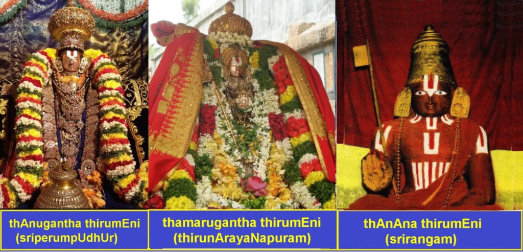 శ్రీ రామానుజులు శ్రీపెరుంబుదూరులో చిత్తిరై (చైత్ర) మాసంలో తిరువాదిరై (ఆర్ద్ర) నక్షత్రంలో అవతరించారు. అతి దయతో రామానుజాచార్య స్వామి వారు మనకు తొమ్మిది గ్రంథాలను అందించారు — ఇవి నవరత్నాలు అని ప్రసిద్ధి. శ్రీ భాష్యం, గీతాభాష్యం, వేదార్థ సంగ్రహం, వేదాంత దీపం, వేదాంత సారం, శరణాగతి గద్యము, శ్రీరంగ గద్యము, శ్రీవైకుంఠ గద్యము, నిత్య గ్రంథం (తిరువారాధన క్రమం), ఇవి అన్నీ సంస్కృత గ్రంథాలు; రామానుజుల వారు తమిళంలో ఏ గ్రంథమూ రచించలేదు. వేదం యొక్క సారాన్ని శ్రీభాష్యం, వేదార్థ సంగ్రహం, వేదాంత దీపం, వేదాంత సారంలో వివరించారు. శ్రీ మద్భగవద్గీతకు గీతా భాష్యం అనే ప్రత్యేక వ్యాఖ్యానం అందించారు.తమ గద్యత్రయం ద్వారా, ఎమ్పెరుమానార్ మన సంప్రదాయంలోని అత్యంత ముఖ్యమైన భావనను – శరణాగతిని – స్థాపించారు. నిత్యగ్రంథంలో తిరువారాధన విధానాన్ని తెలిపారు. తిరువాయ్మొళికి వ్యాఖ్యానం రాసే పద్ధతిని కూడా ఆయనే రూపొందించారు. ఈ విధంగా ఎంపెరుమానార్ల గొప్పతనం , కీర్తి ప్రతిష్టలు అపారం.